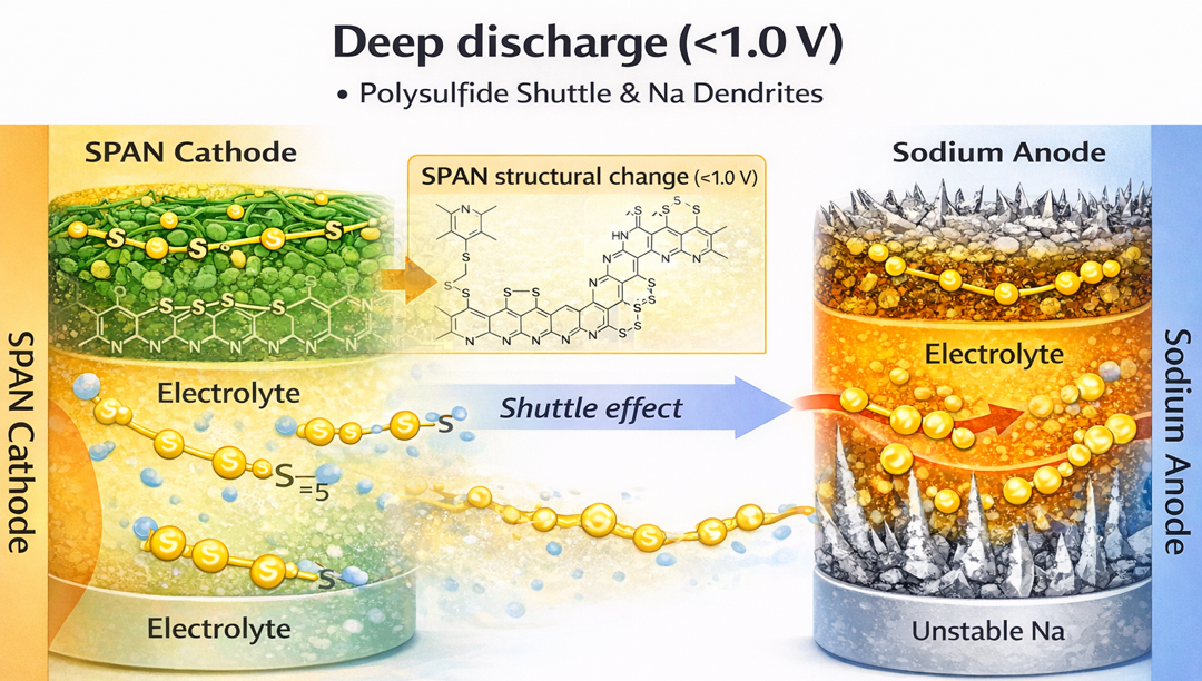 We find that deep discharge below 1.0 V causes structural changes in SPAN, leading to the formation of soluble polysulfides. These species migrate to the sodium anode, triggering side reactions, uneven sodium deposition, and dendrite growth. As a result, the battery experiences a loss of capacity and reduced lifespan.